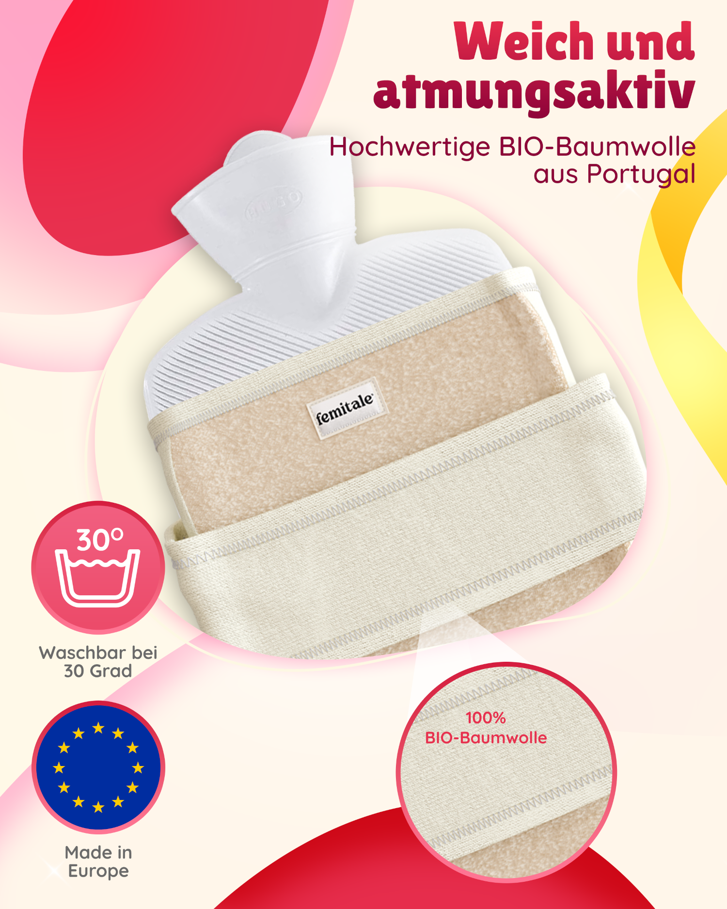 Ob bei Nacken-, Rücken-, Schulter oder Periodenschmerzen ist dieser innovative Wärmflaschengürtel eine ideale Hilfe. Er ist aus atmungsaktiver, weicher Bio-Baumwolle gefertigt und sorgt für festen Halt - punktgenau da, wo die Wärme gebraucht wird und ohne zu verrutschen. Direkter Hautkontakt mit der Wärmflasche wird vermieden. Somit ist der Gürtel auch über einen längeren Zeitraum angenehm zu tragen und hilft Verspannungen und Schmerzen zu lindern.